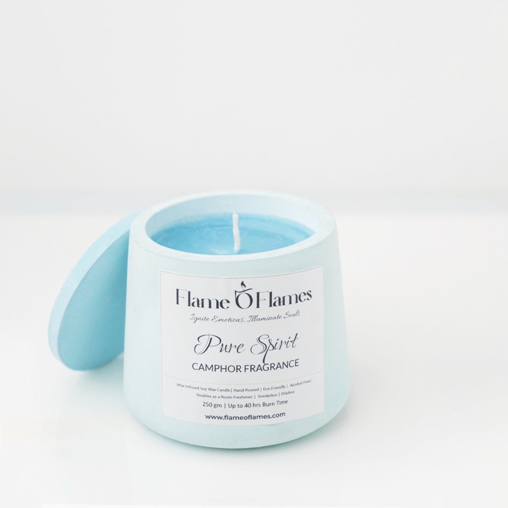 Pure Spirit is a candle crafted for those who seek clarity, purity, and renewal. Presented in a hand-poured ocean blue concrete jar, this luxury soy candle is infused with the cooling and therapeutic essence of Camphor attar, known for its ability to cleanse the air, refresh the mind, and create a sense of serenity.